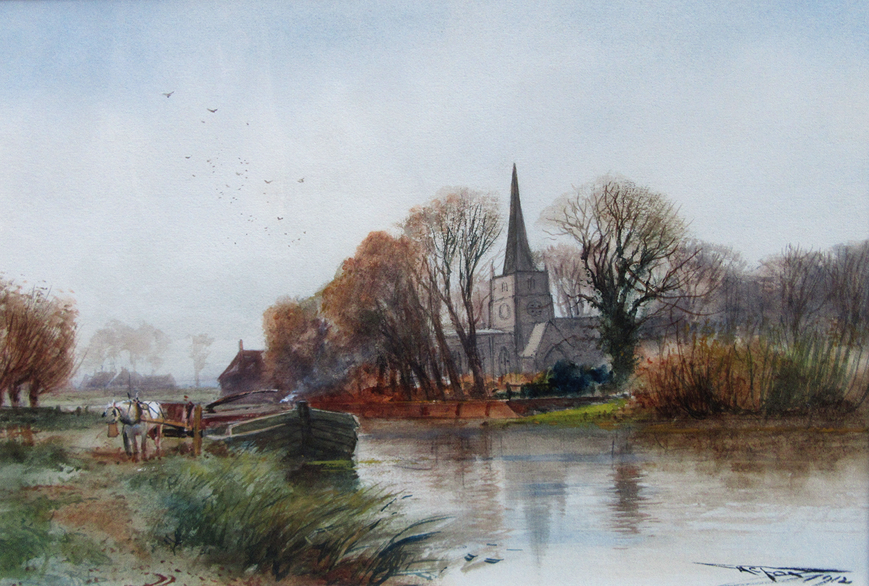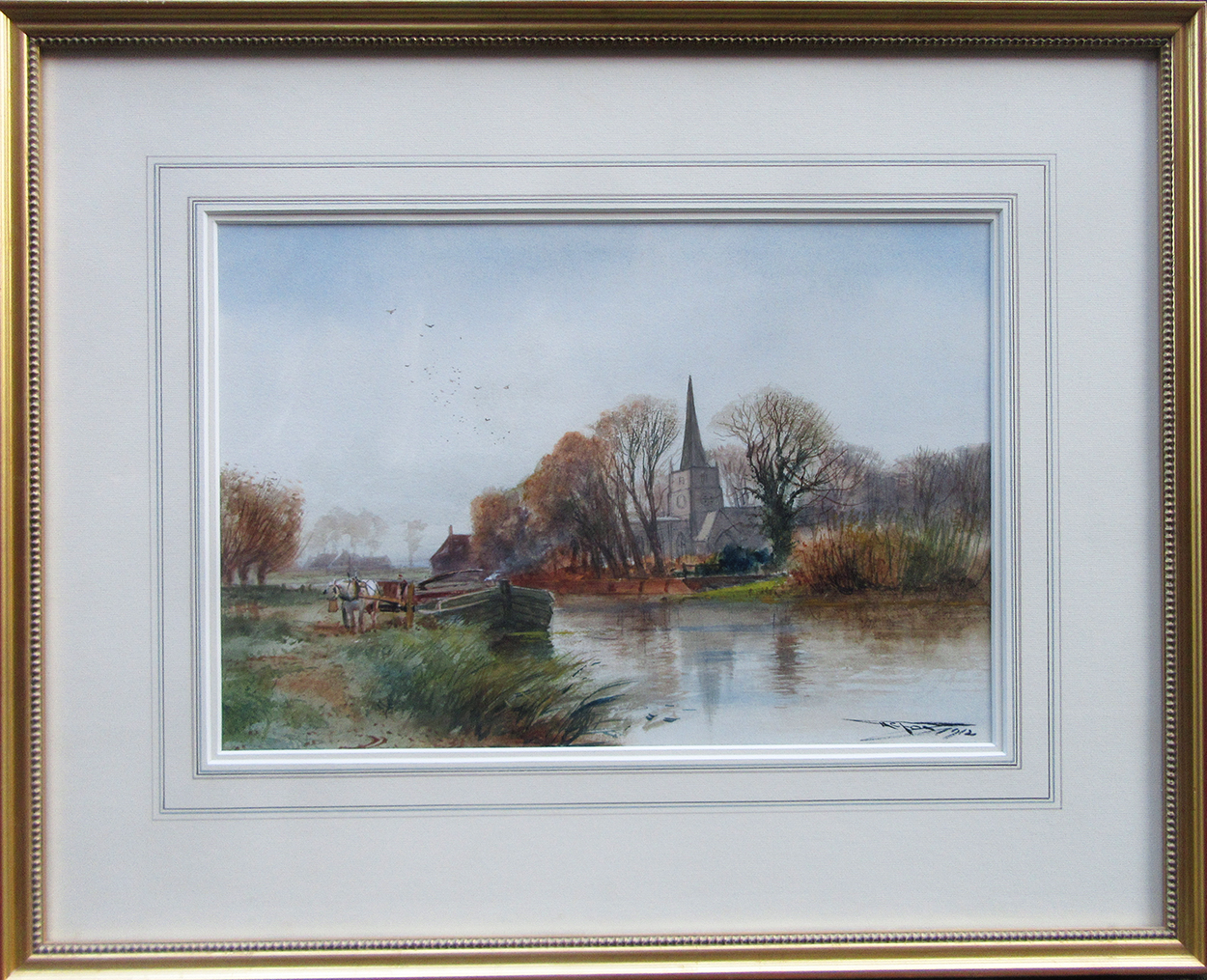 This lovely watercolour painting of Swarkestone, Derbyshire is signed by the artist Henry Charles Fox, in the lower right corner. The painting is finished with a classic gold frame and washline mount.