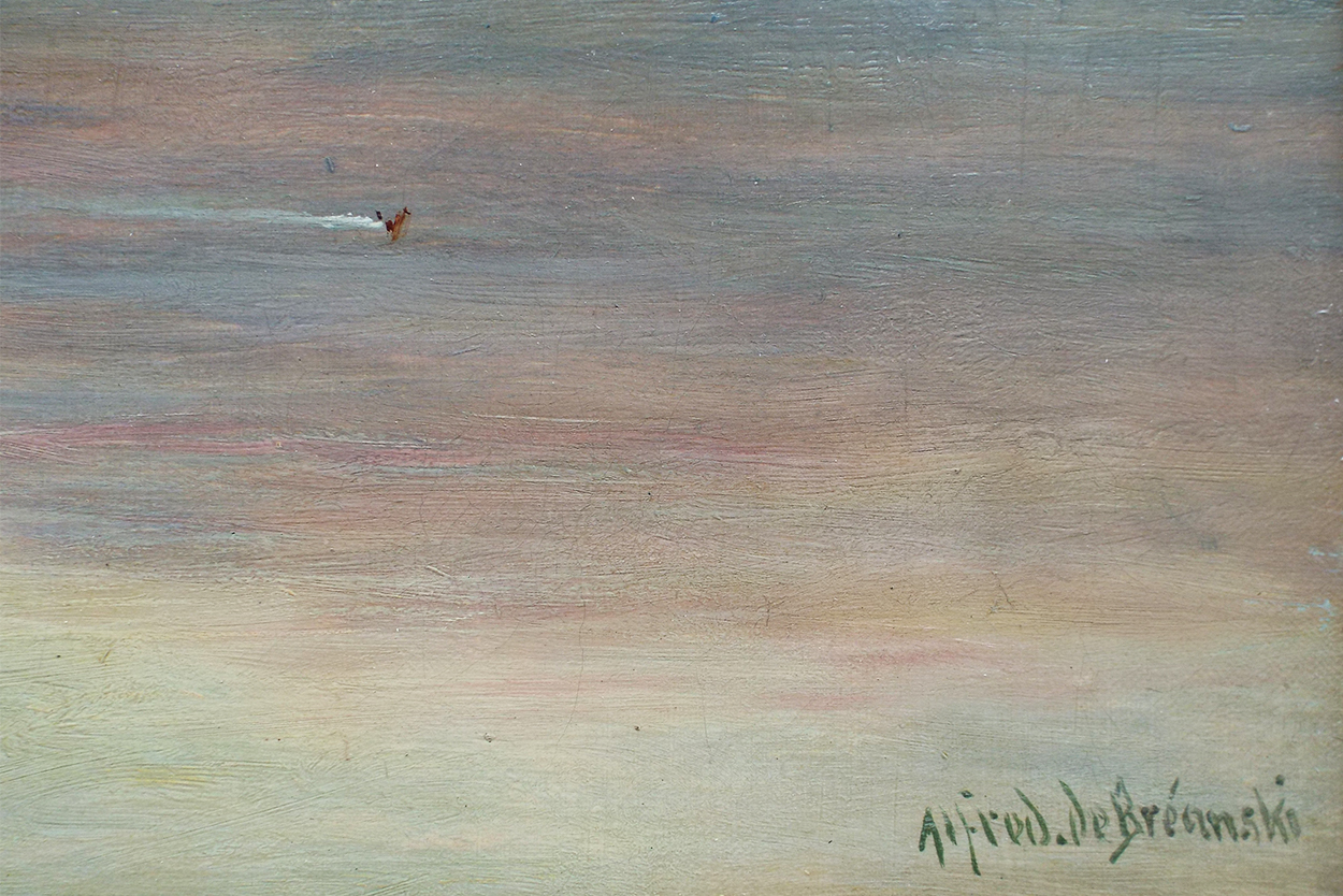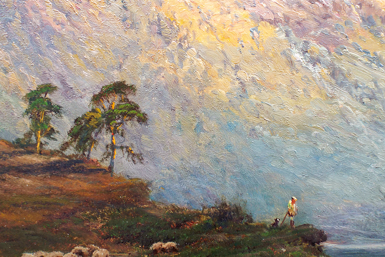 Alfred De Breanski Snr. was born in Greenwich in 1852 and died in 1928. He was the oldest son in his family and his two other siblings, Gustave and Julie, also became painters. De Breanski completed his training quickly, and made his debut at the Royal Academy in 1872. By the 1870s, he had embraced landscape painting and travelled to the isolated regions of Wales and Scotland in search of wilderness landscapes, creating a unique blend of romanticism and realism.