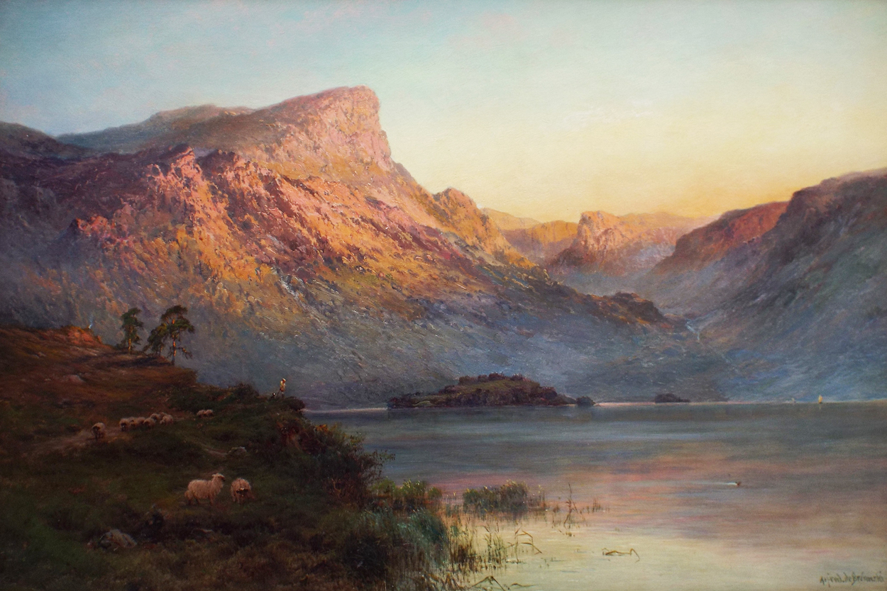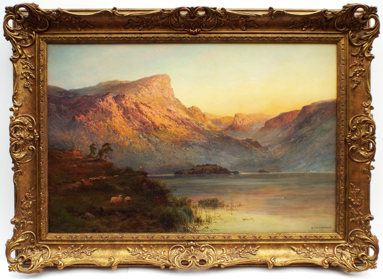 Oil painting of Loch Lomond in Scotland signed by the artist Alfred de Breanski Sr, in the lower right corner.