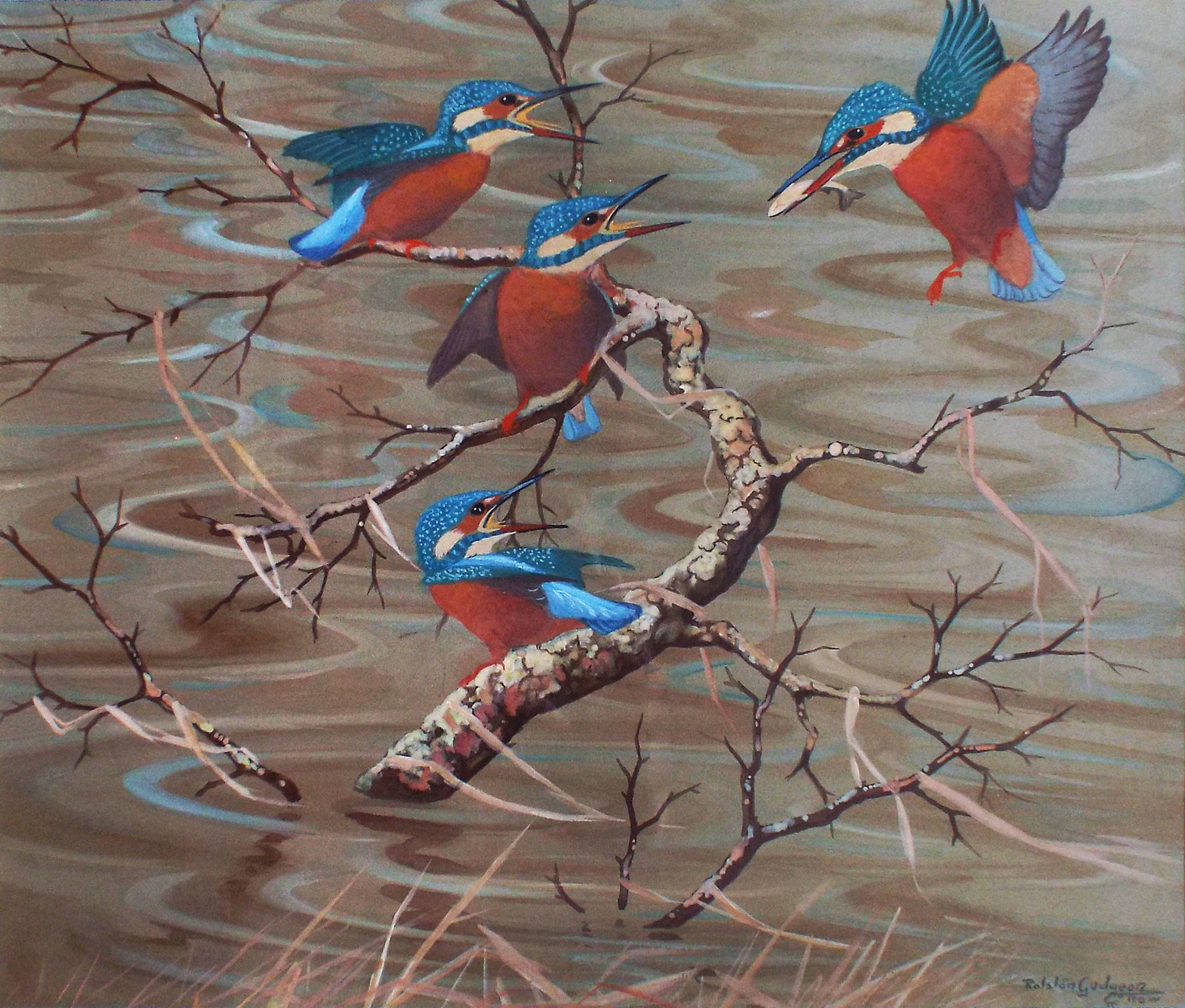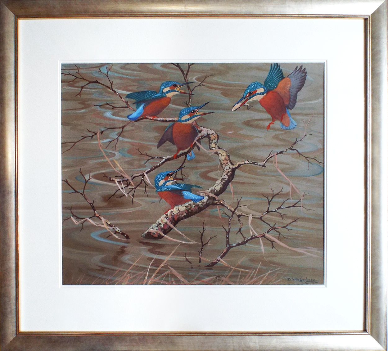 This beautiful gouache watercolour painting of kingfishers feeding is signed by the artist, Ralston Gudgeon in the lower right corner. The painting is finished with a high-quality classic champagne frame.