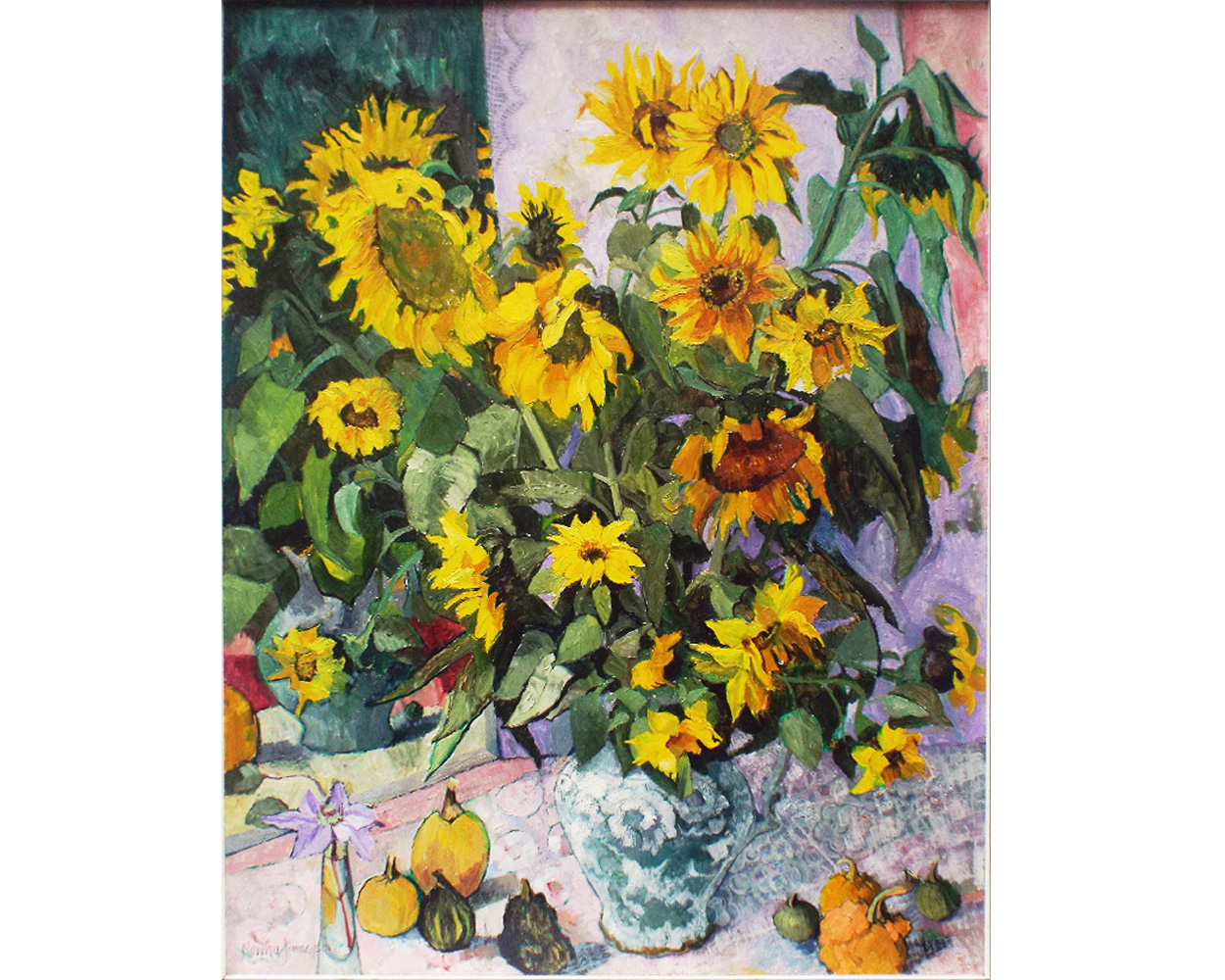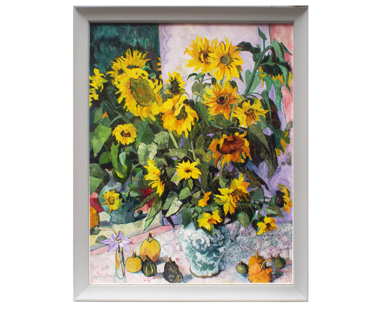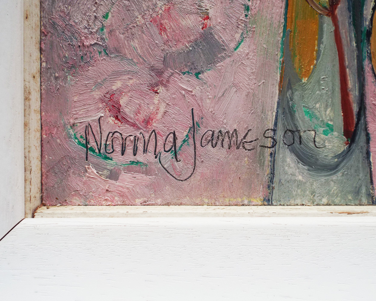 This oil painting is signed by the artist, Norma Jameson. It is finished with a high-quality modern white frame.